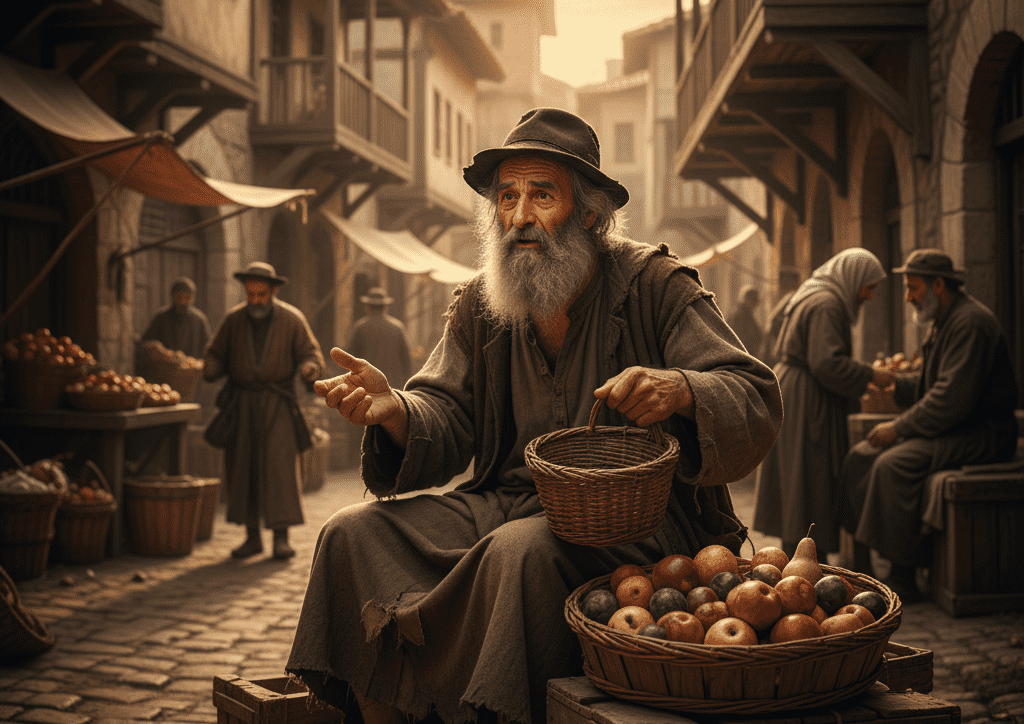 סיפור לפרשת נצבים משל הרוכל של המגיד מדובנא ומשל ר' שמחה בונם "והיה כי תמצאן אתו רעות רבות וצרות" (דברים, לא, כא). המגיד מדובנא הסביר את הפסוק באמצעות משל: כרוכל בשוק, שעם ערב, כשרוב סחורתו כבר נמכרה ונשארו לו רק שאריות, הוא ממהר הביתה. הוא מערבב את מעט האגסים שנשארו לו, את השזיפים הבודדים ואת […]